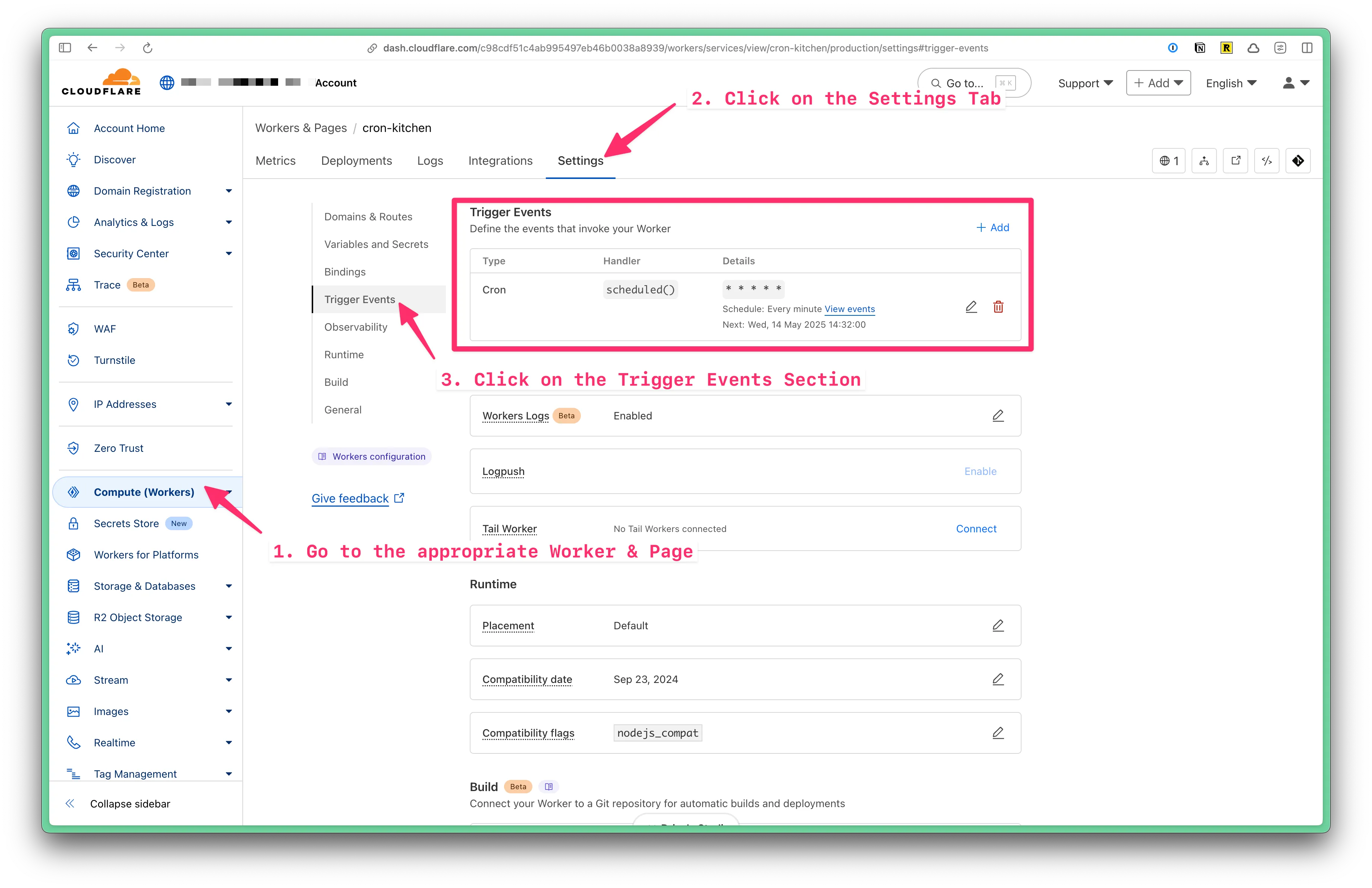 Within the Cloudflare Dashboard UI, you can view all the cron triggers for your worker. Click on the Settings tab, and then click on the Cron Triggers section.