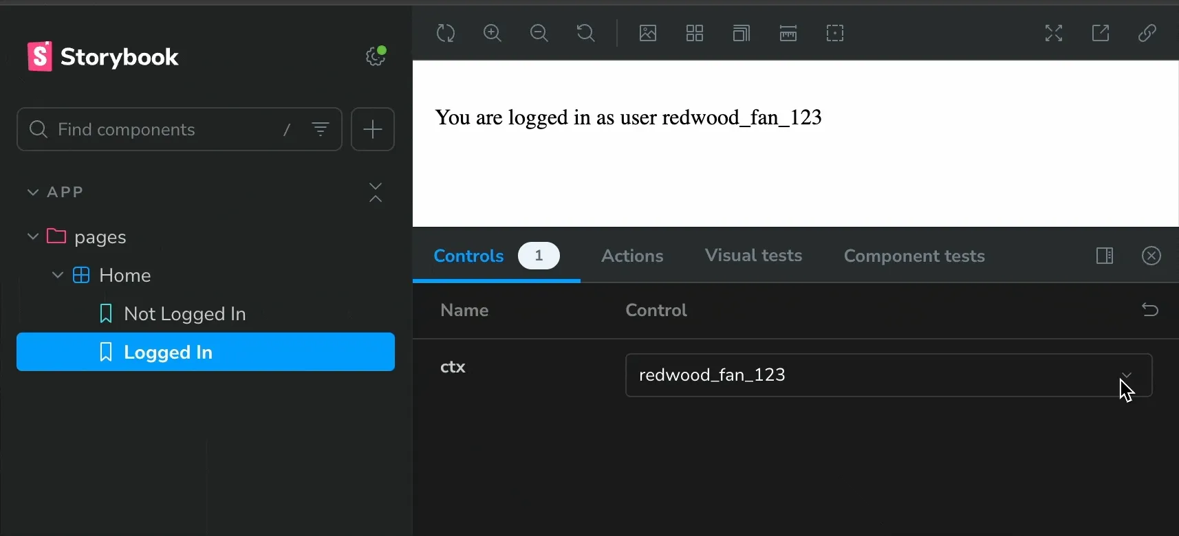 4. Save it, and go back to our Storybook site. We should see a new “Logged In” story:
