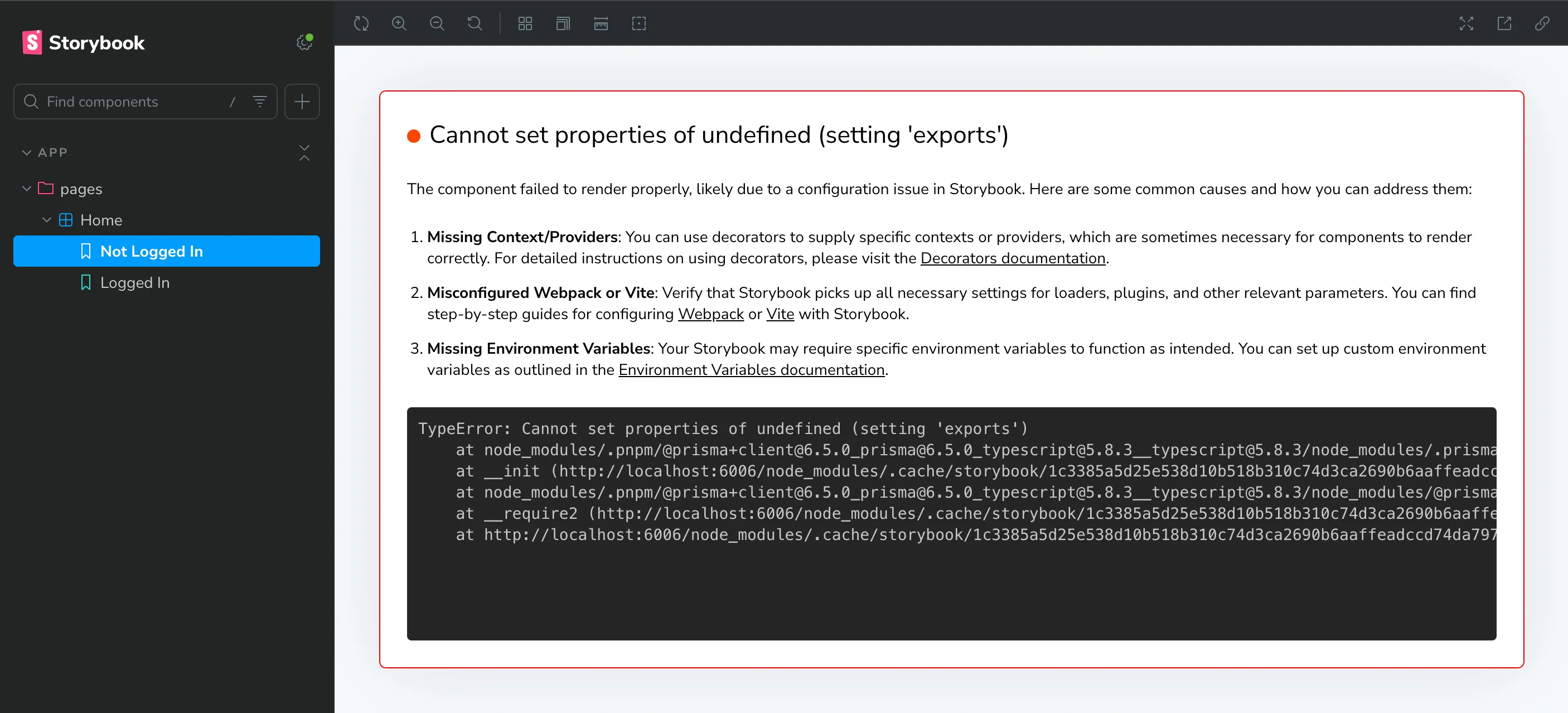 2. Now, if we go to our Storybook site, we’ll see that it throws an intimidating error. Take a closer look, and we’ll see that it’s coming from the Prisma client: