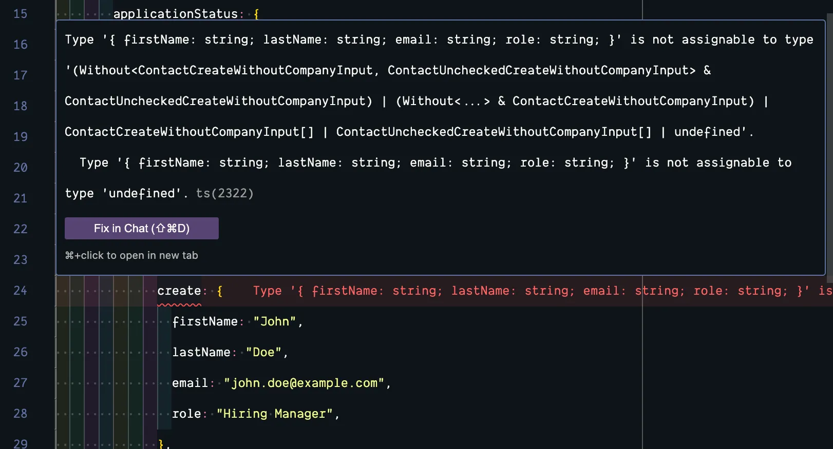 user: { connect: { id: "c4f35853-8909-4139-98bb-c08663e4230c", },},If you scroll down within the applicationSeed.ts file, you’ll notice there’s an error when creating a contact: