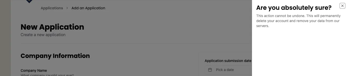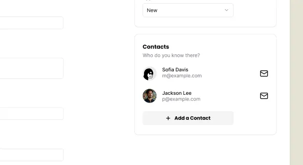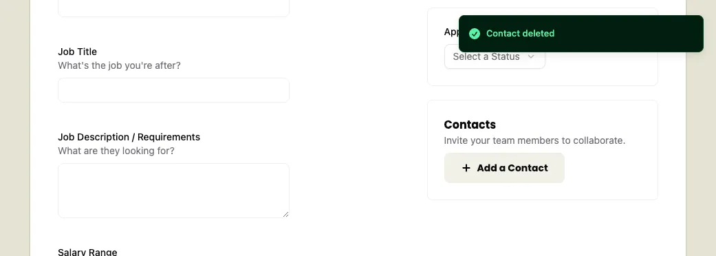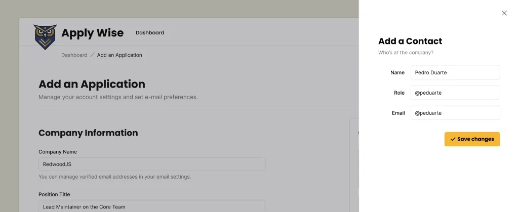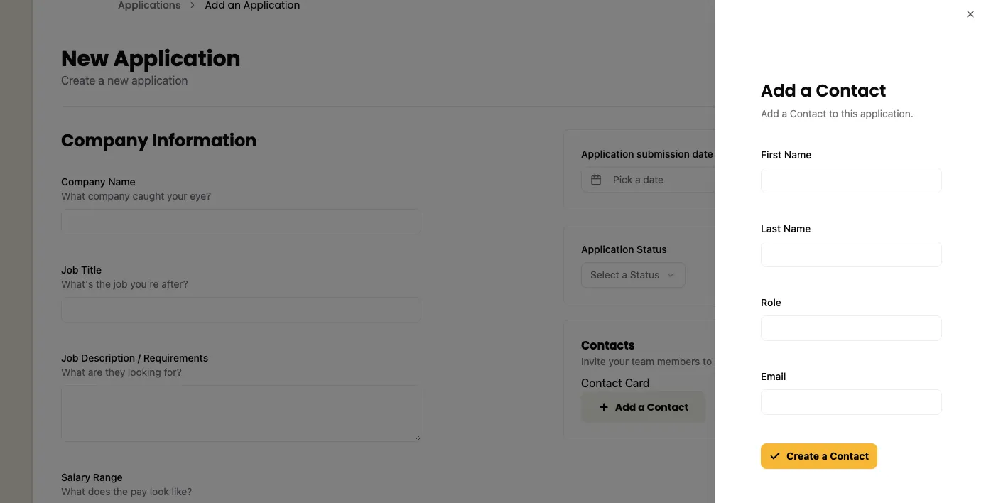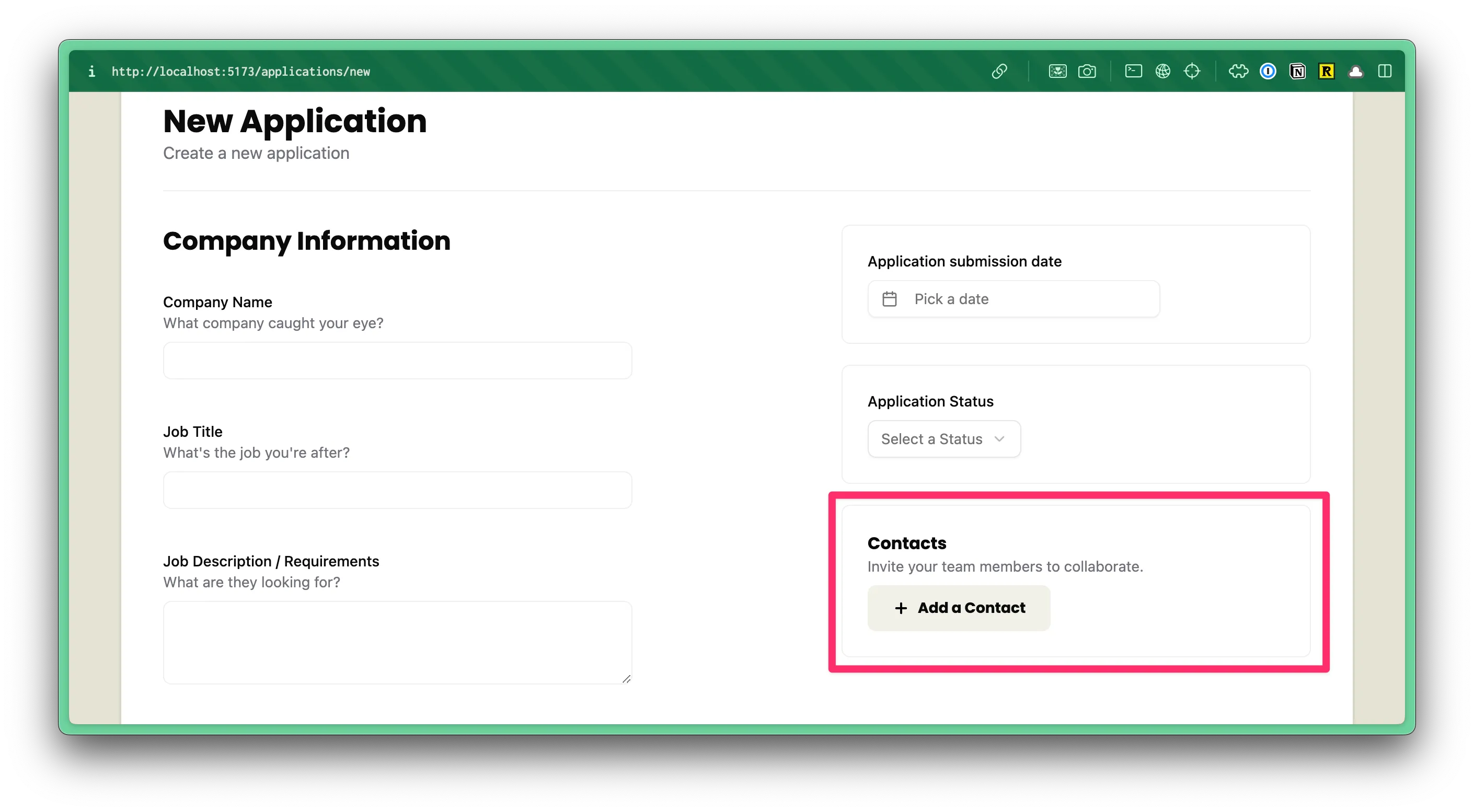 company: { create: { name: formData.get("company") as string, contacts: { create: { firstName: "John", lastName: "Doe", email: "john.doe@example.com", role: "Hiring Manager", userId: ctx.user.id, } connect: contacts, }, },},Now, when you create a new job application, any contacts you’ve listed will be associated with the company and job application you created.