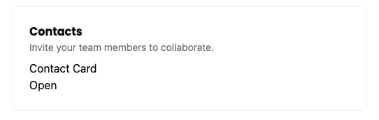 <div className="box"> <h3>Contacts</h3> <p className="input-description">Invite your team members to collaborate.</p> <div> Contact Card </div> <Sheet> <SheetTrigger>Open</SheetTrigger> <SheetContent> <SheetHeader> <SheetTitle>Are you absolutely sure?</SheetTitle> <SheetDescription> This action cannot be undone. This will permanently delete your account and remove your data from our servers. </SheetDescription> </SheetHeader> </SheetContent> </Sheet></div>If you take a look at this within the browser, you should see the “Open” trigger: