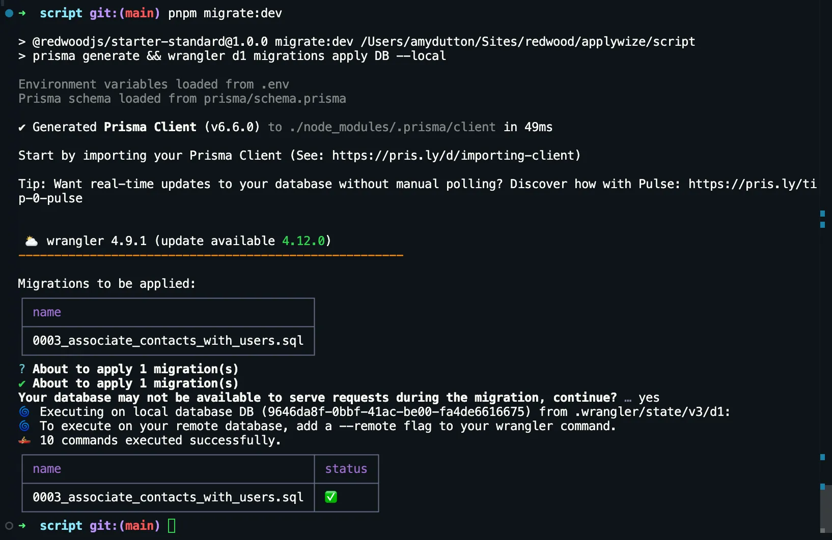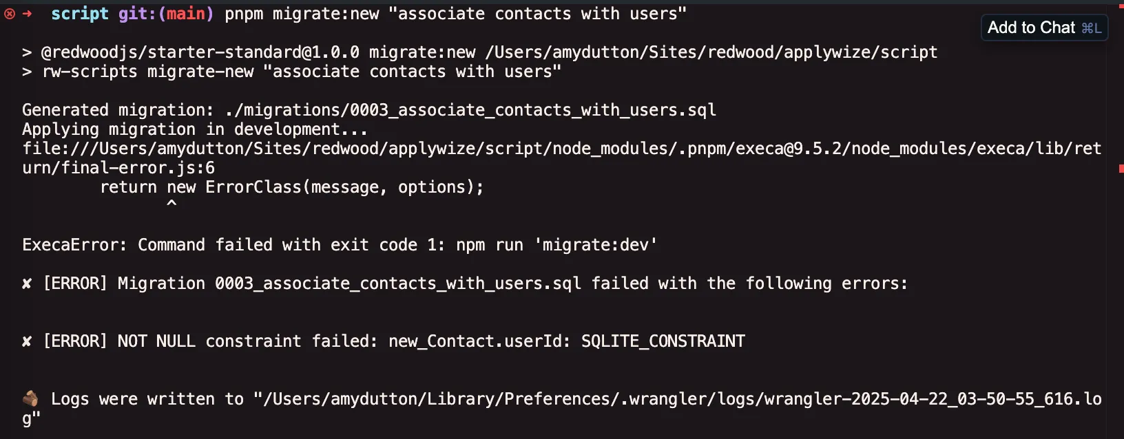 npm run migrate:new "associate contacts with users"pnpm run migrate:new "associate contacts with users"yarn run migrate:new "associate contacts with users"When you run this, you’ll probably get an error: