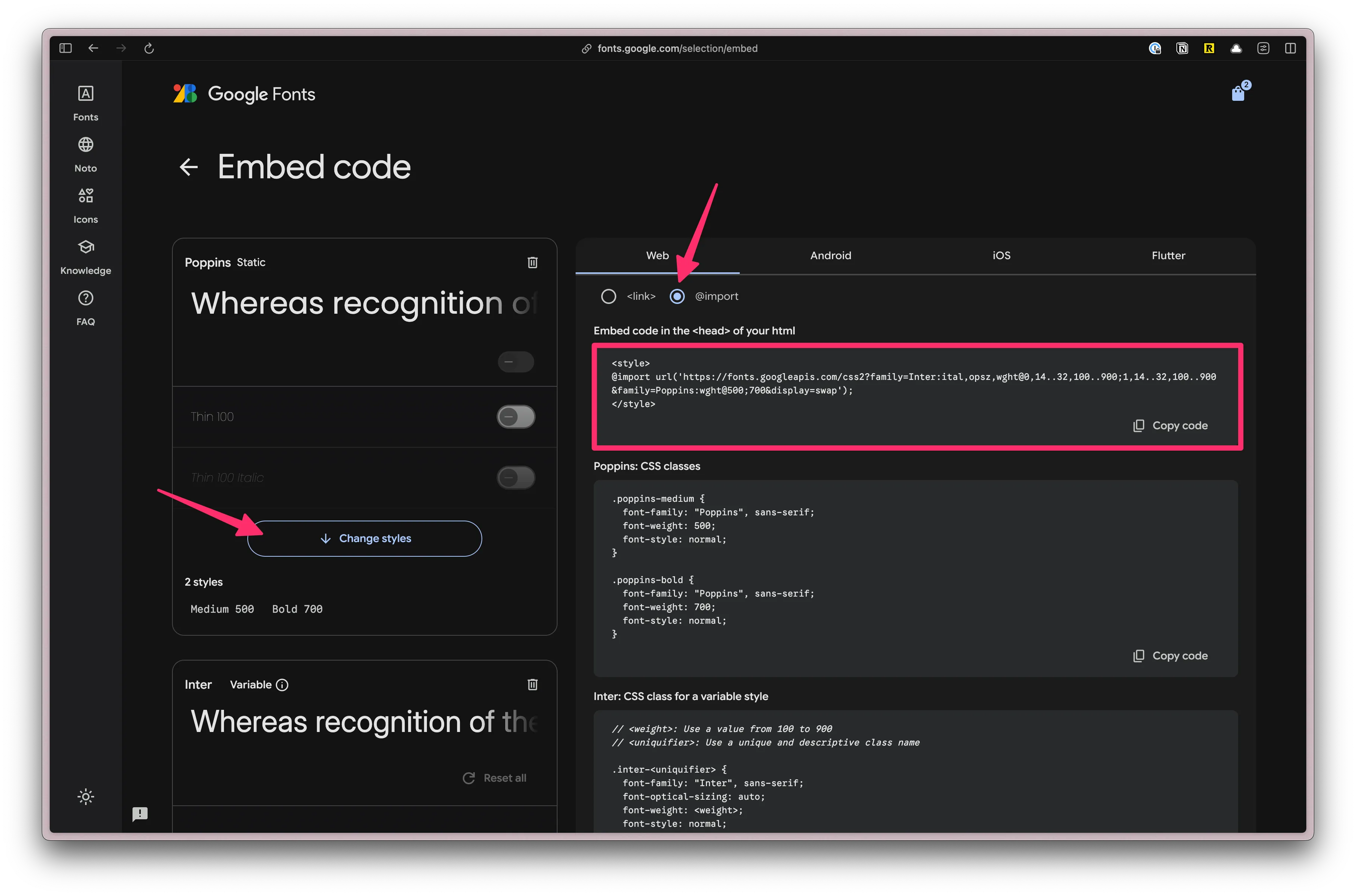 Under Poppins, click on the “Change Styles” button. Turn everything off except for “500” and “700”.