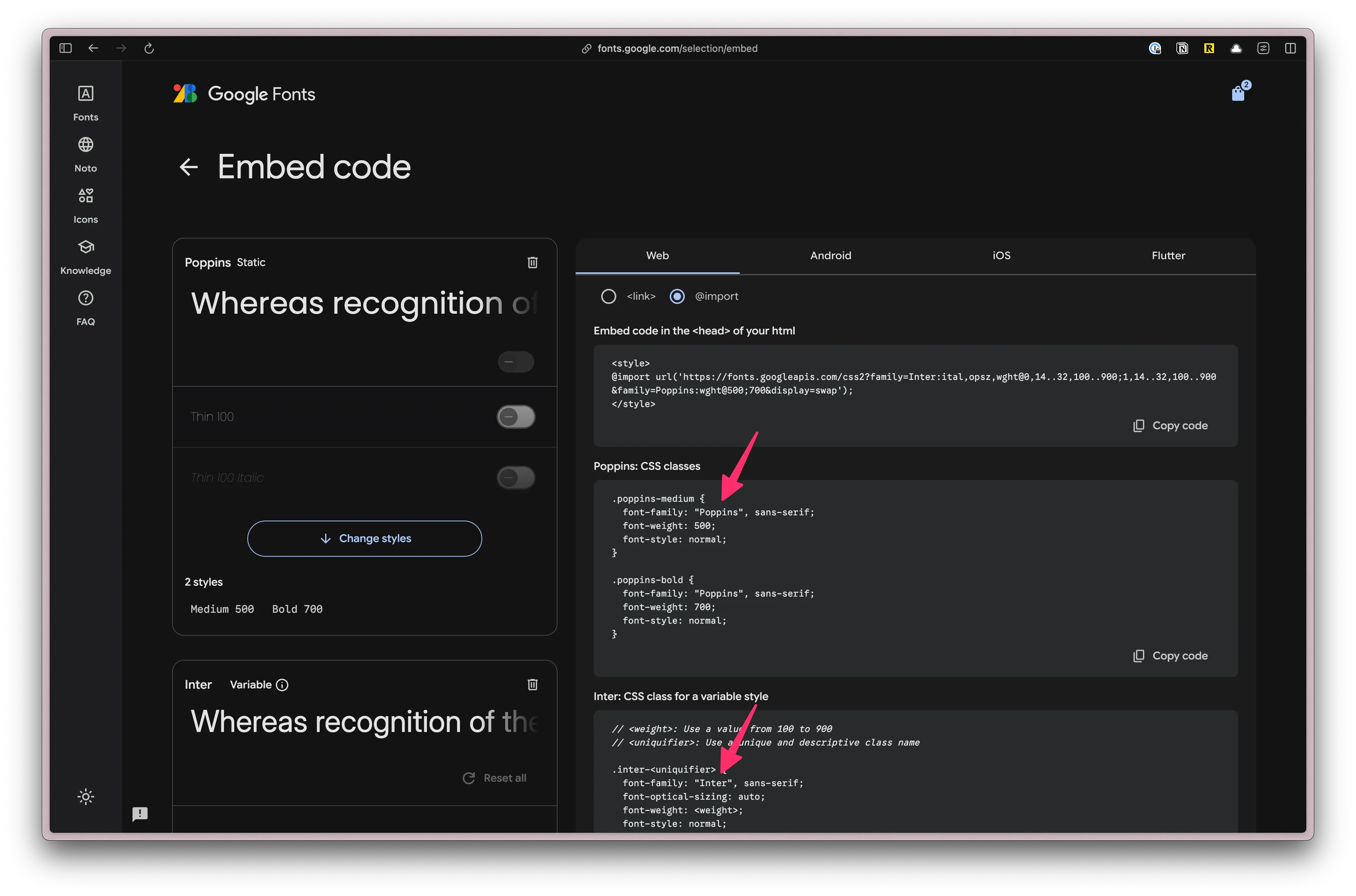 @theme { --font-display: "Poppins", sans-serif; --font-body: "Inter", sans-serif;}If you’re unsure how the font-family is written, you can find it in the CSS class definition on the Google Fonts page. Here, Poppins and Inter are both in quotes and capitalized.