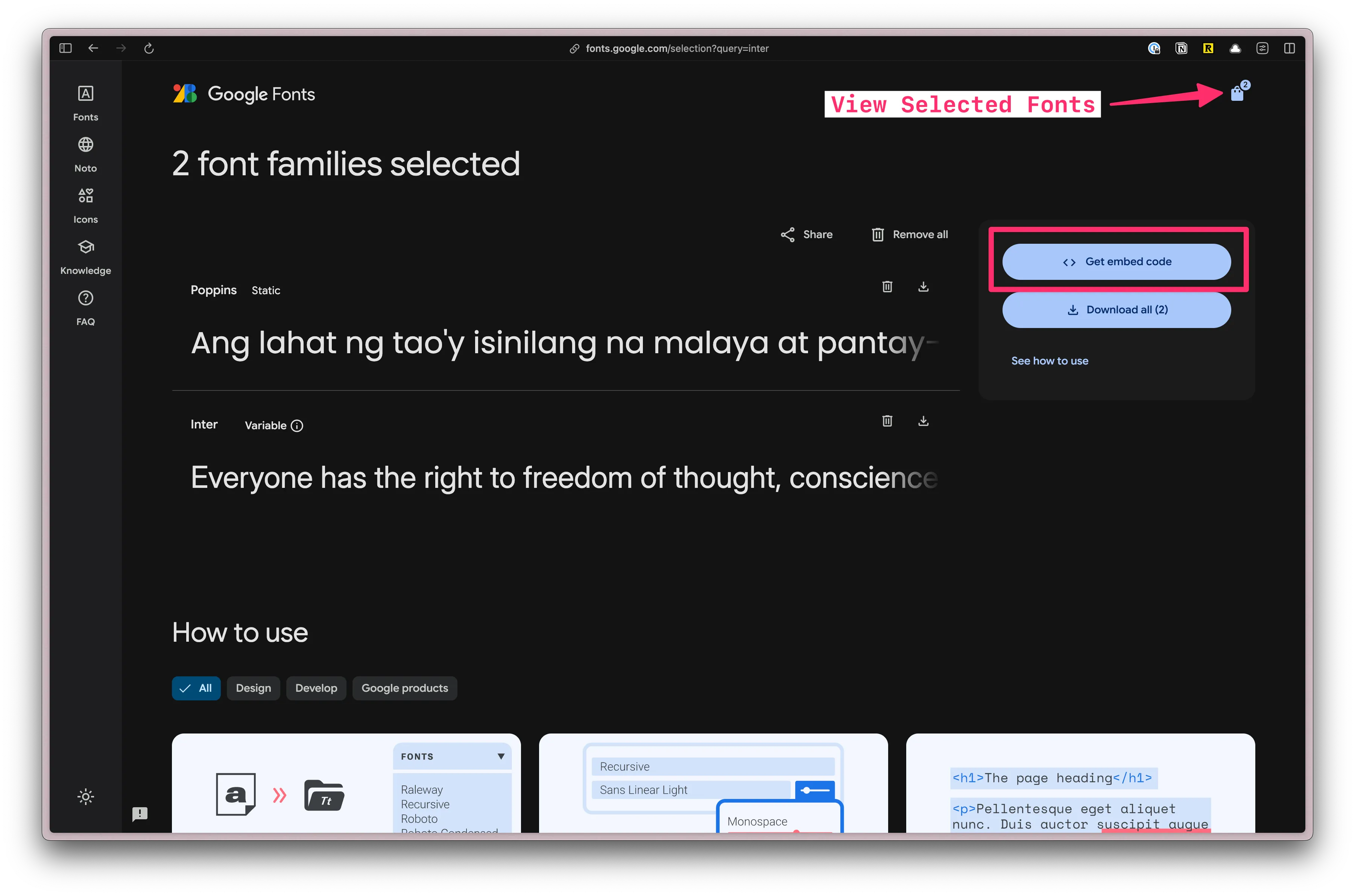 Once both fonts have been added, click on the “View selected families” button on the top right. Then, click on the “Get Embed Code” button.