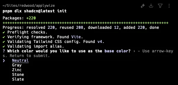 Terminal window npx shadcn@latest initTerminal window pnpx shadcn@latest initTerminal window yarn dlx shadcn@latest initIt will ask you what theme you want to use. Let’s go with Neutral.