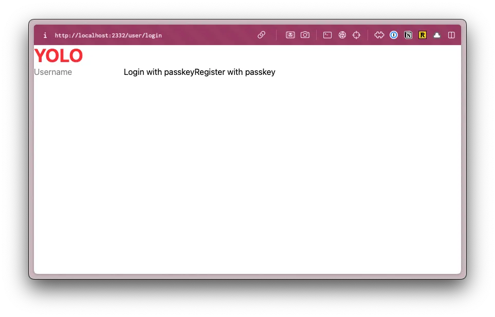 <h1 className="text-4xl font-bold text-red-500">YOLO</h1> <input type="text" value={username} onChange={(e) => setUsername(e.target.value)} placeholder="Username" /> <Button onClick={handlePerformPasskeyLogin} disabled={isPending}> {isPending ? <>...</> : "Login with passkey"} </Button> <Button onClick={handlePerformPasskeyRegister} disabled={isPending}> {isPending ? <>...</> : "Register with passkey"} </Button> {result && <div>{result}</div>} </>);Now, when you visit http://localhost:5173/user/login, you should see styled buttons: