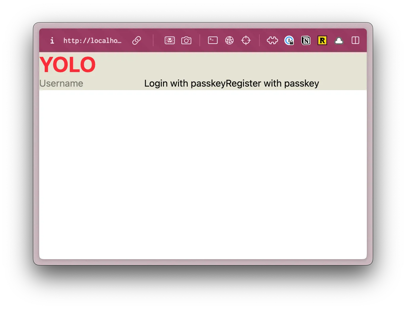 <h1 className="text-4xl font-bold text-red-500">YOLO</h1> <input type="text" value={username} onChange={(e) => setUsername(e.target.value)} placeholder="Username" /> <Button onClick={handlePerformPasskeyLogin} disabled={isPending}> {isPending ? <>...</> : "Login with passkey"} </Button> <Button onClick={handlePerformPasskeyRegister} disabled={isPending}> {isPending ? <>...</> : "Register with passkey"} </Button> {result && <div>{result}</div>} </main> );}When you visit http://localhost:5173/user/login, you should see a beige background color: