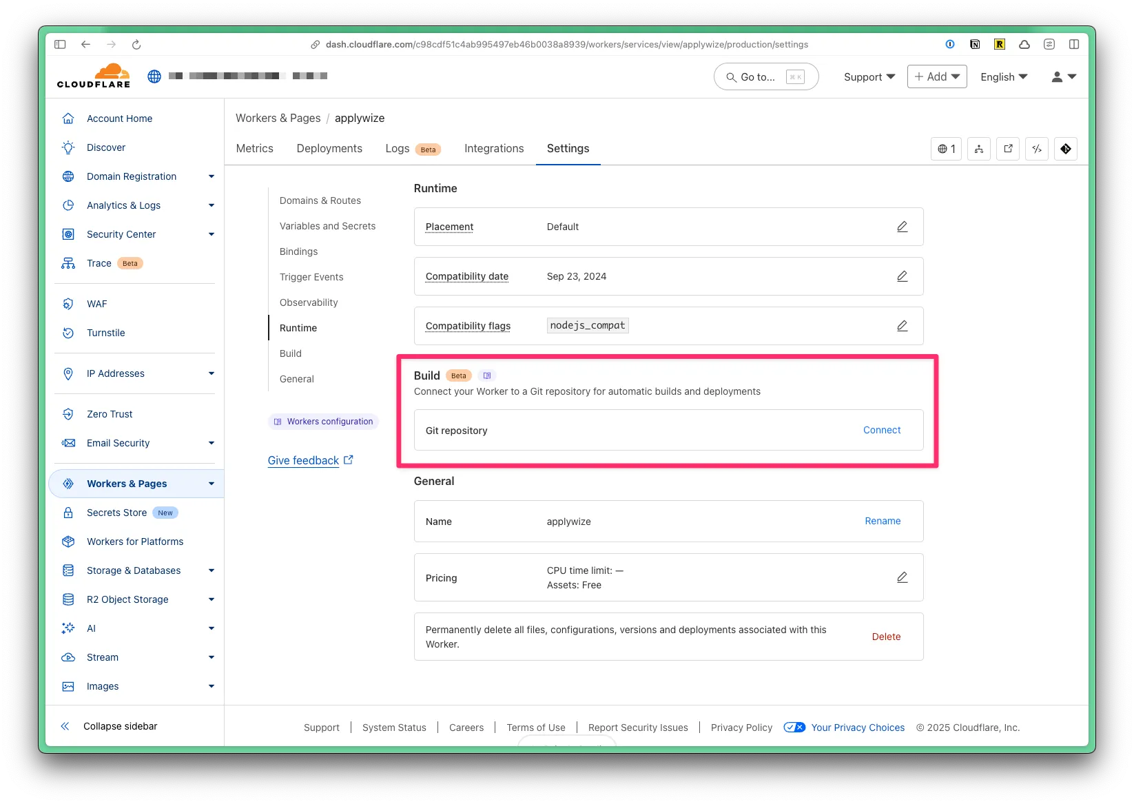 If for whatever reason, you need to delete your project through Cloudflare, go to Workers & Pages in the left side navigation. Then, click on the name of your project. Click on the Settings tab, then scroll to the bottom of the page. Click on the Delete button.