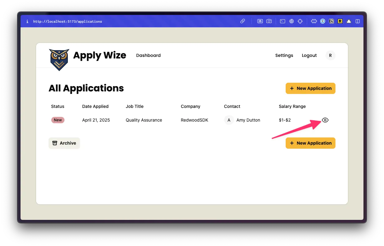 If run go to our Applications list view and click on the eye icon, next to any application, it should take us to the detail page: