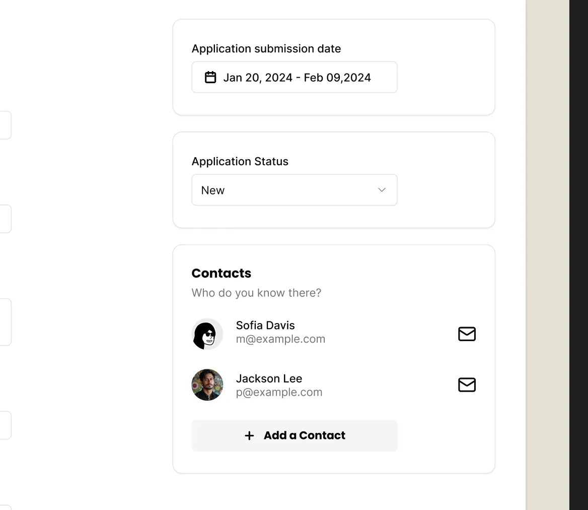 {/* right side */}<div> <div className="box"> <label>Application submission date</label> <DatePicker name="dateApplied" /> </div></div>Our DatePicker component is a shadcn/ui component, so we’ll need to import it at the top of our file: