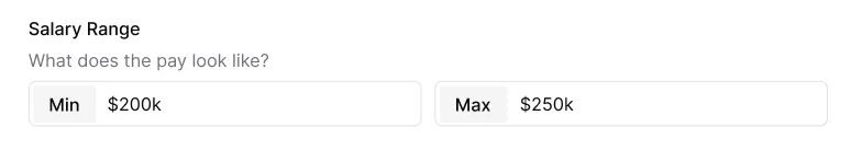 <div className="field"> <div className="label">Salary Range</div> <p className="input-description">What does the pay look like?</p> <div> <div> <label htmlFor="salaryMin">Min</label> <input type="text" id="salaryMin" name="salaryMin" /> </div> <div> <label htmlFor="salaryMax">Max</label> <input type="text" id="salaryMax" name="salaryMax" /> </div> </div></div>We can add a class of flex gap-4 to the div wrapping our inputs to get the minimum and maximum inputs aligned side by side: