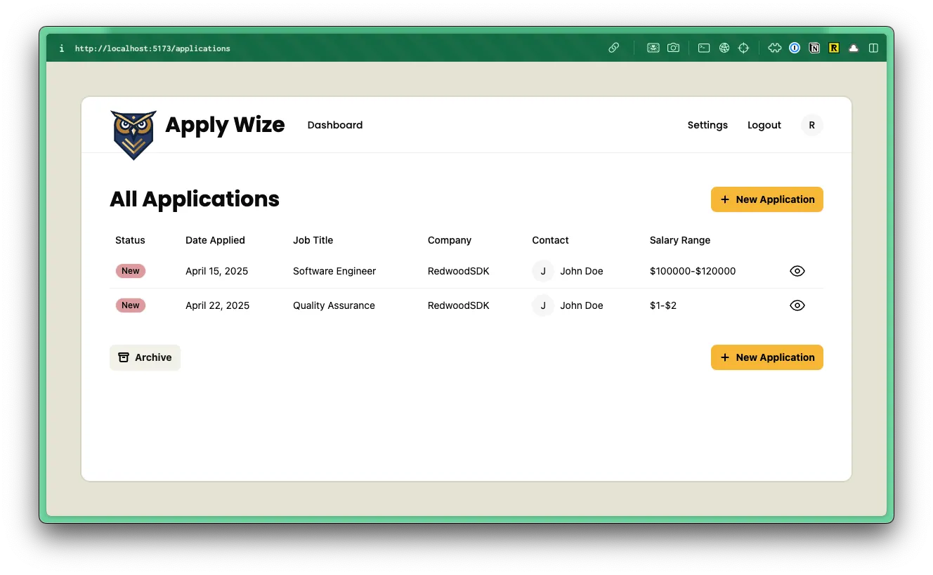 import { createApplication } from "@/app/pages/applications/functions"Now, let’s test this out. Fill out the form, click the “Create” button, and you should be redirected to the applications page and see your new application in the list. 😎